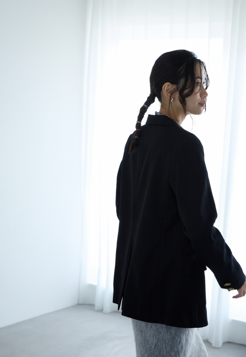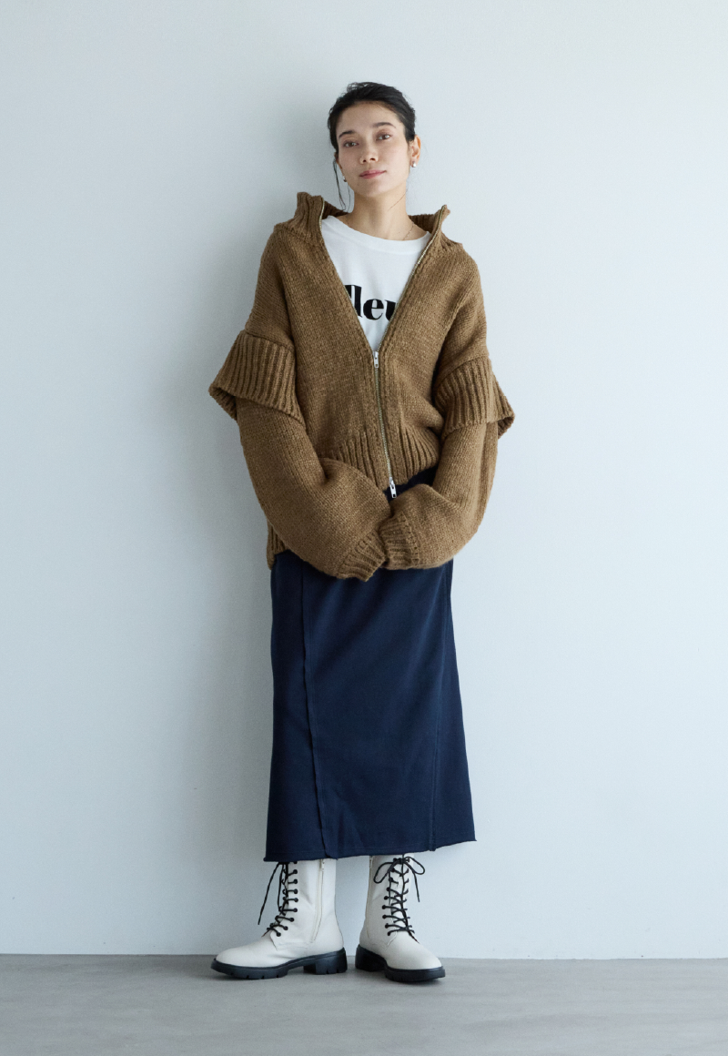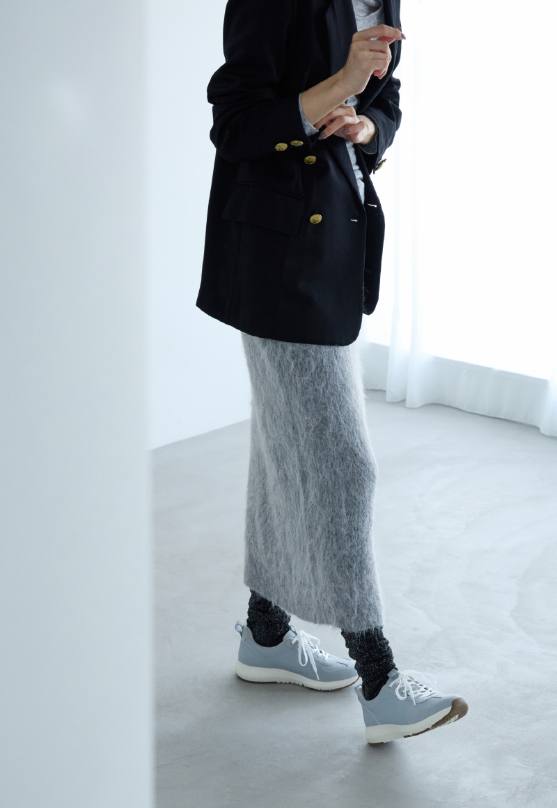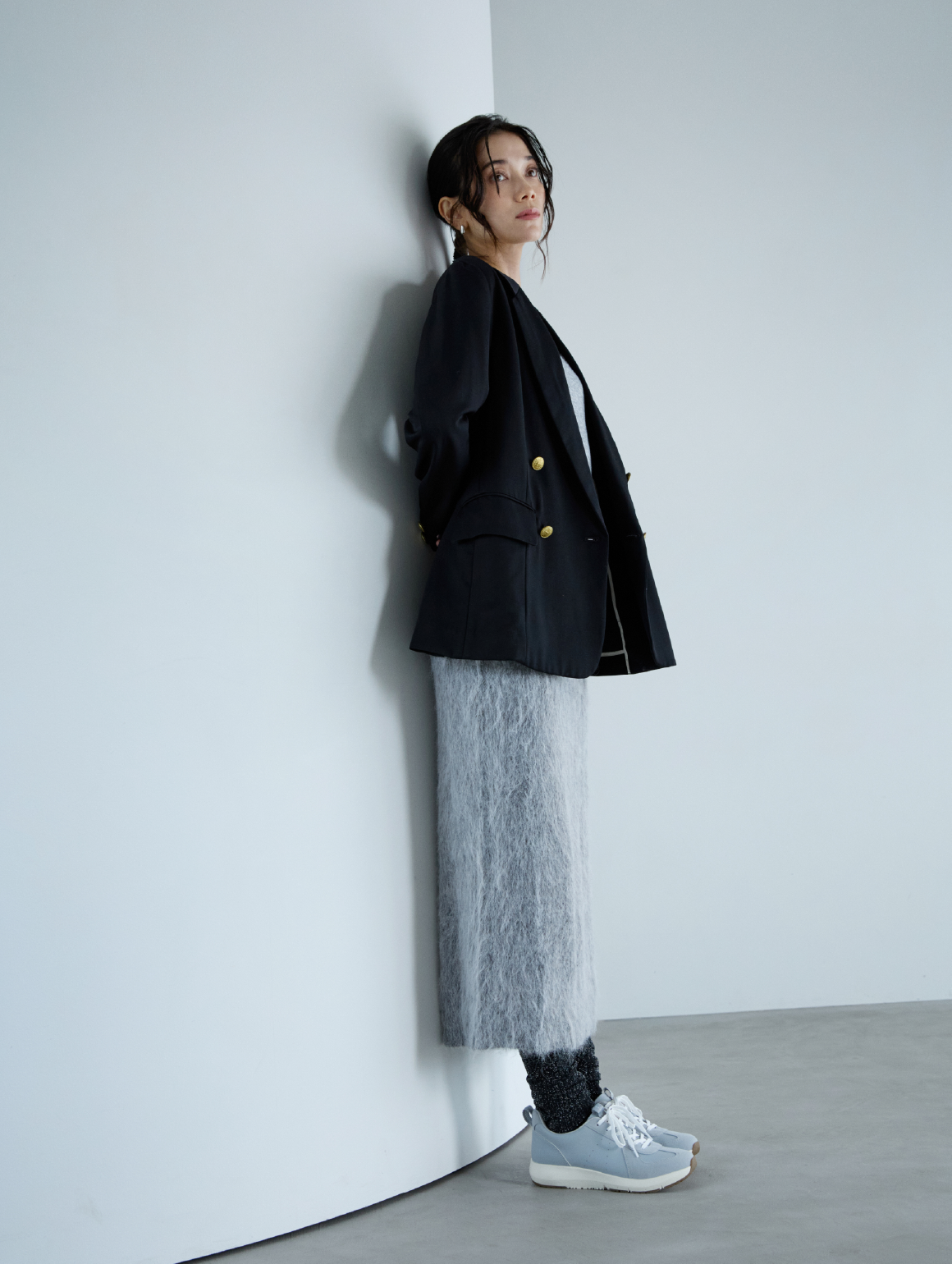 やわらかなレイヤードトップスとシャギーのタイトスカートで、シンプルながらも⽴体感を出して。仕上げに⽻織った⾦ボタンのネイビージャケットで全体を引き締めて、カジュアルだけど⼿抜きに⾒せない、⼤⼈のための上品カジュアルスタイル。AO-10268