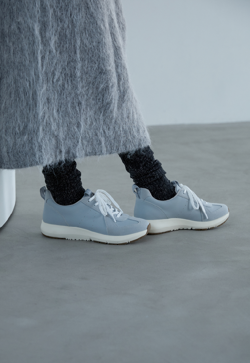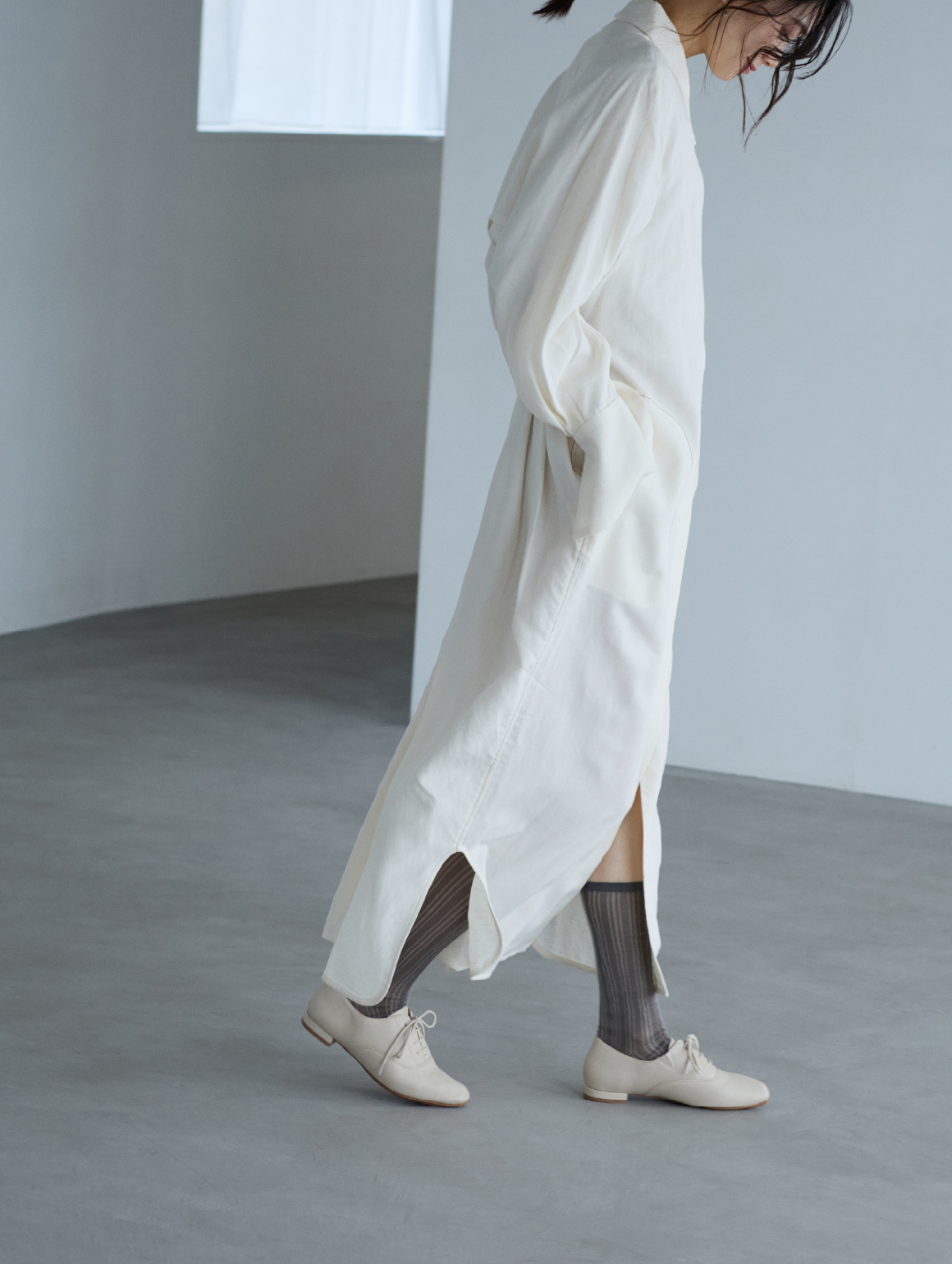 繊細なグレーのシアーソックスを合わせて、抜け感と⼥性らしさをプラス。