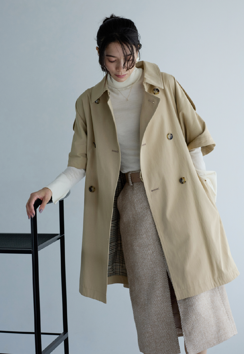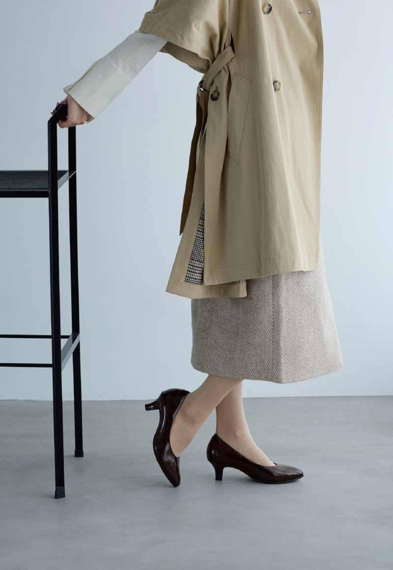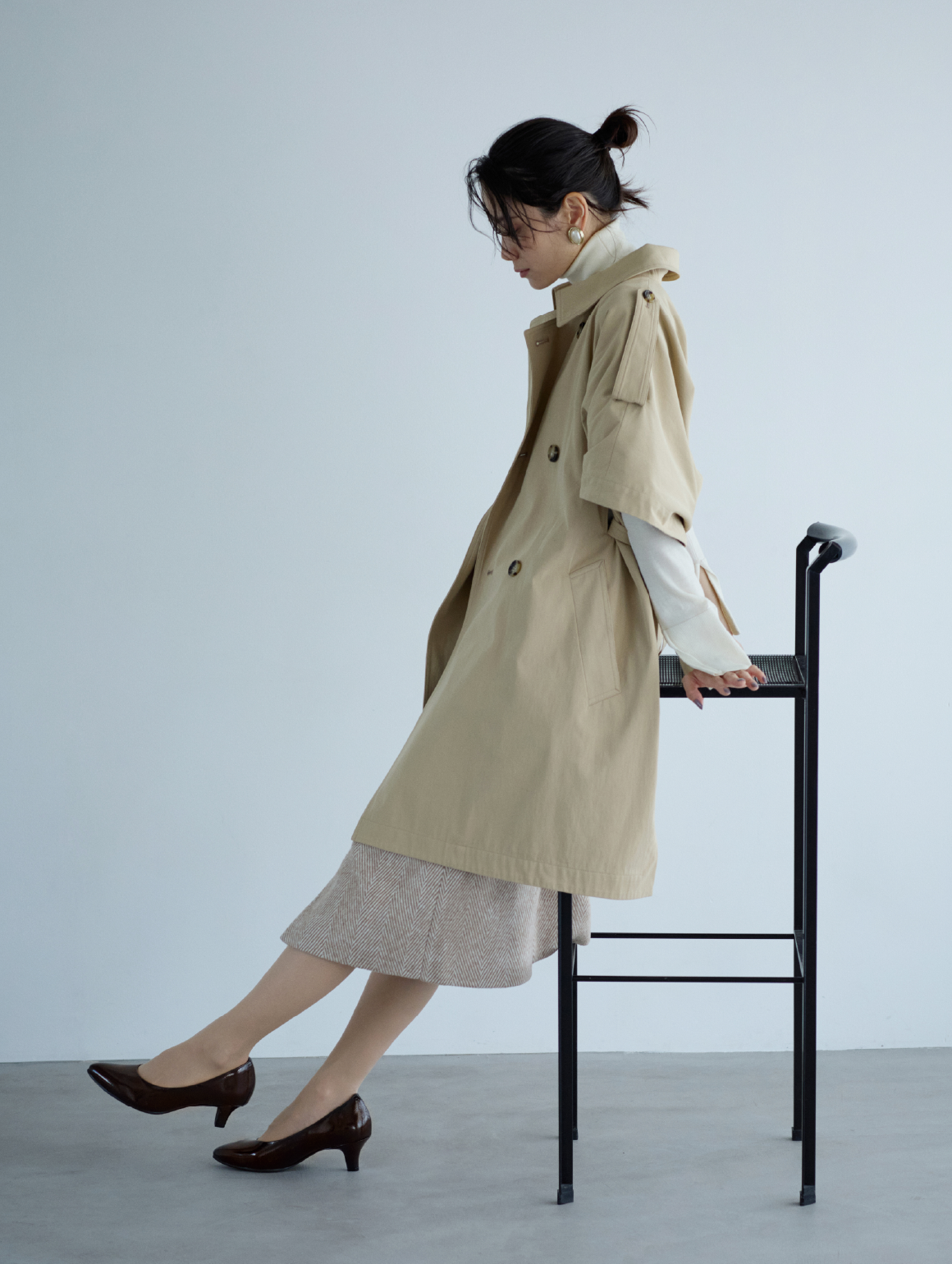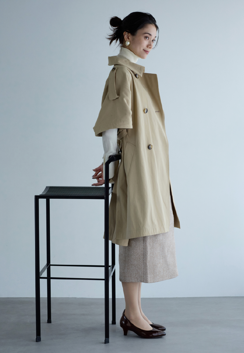 艶のあるダークブラウンのパンプスが、⾜元にこっくりとした深みと⼥性らしさを添えるコーデ。シルエットが魅⼒の半袖トレンチポンチョに、タートルネック、ヘリンボーン柄のスリットタイトスカートを合わせて、レイヤードを楽しんで。