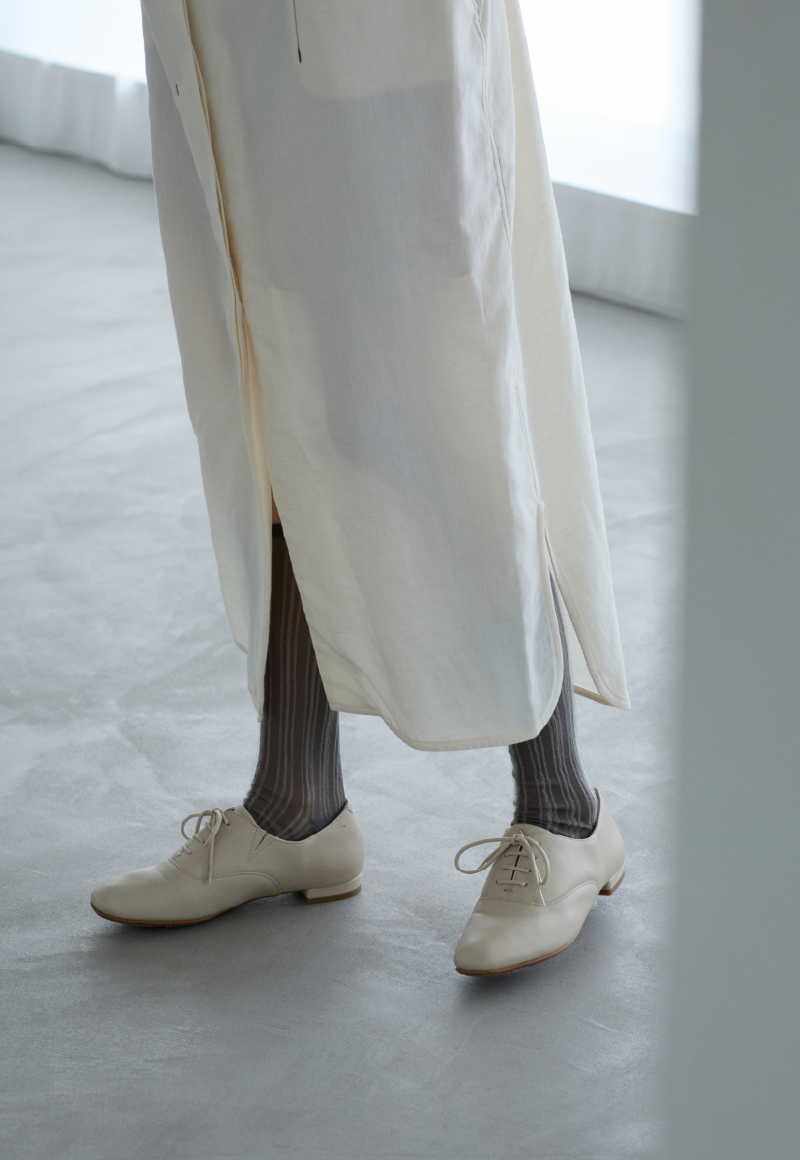 ⾜元にほんのりクラシカルな存在感を添える、アイボリーのレースアップシューズを主役に。