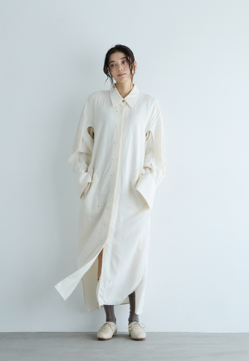クリーンな印象のロングシャツワンピースを合わせて上品でセンシュアルなコーデに。AO-10229