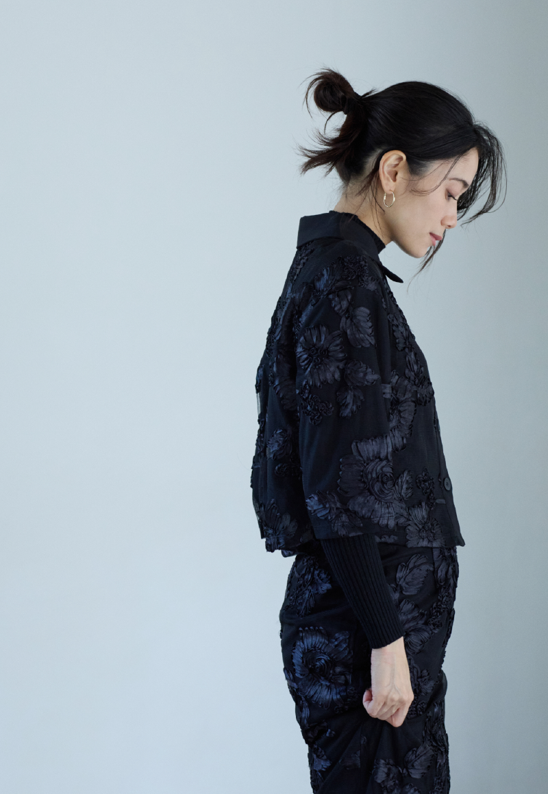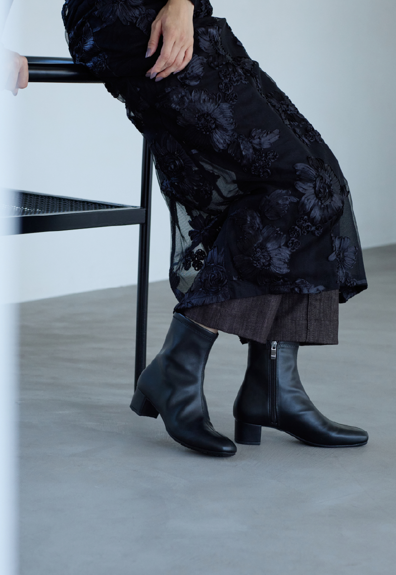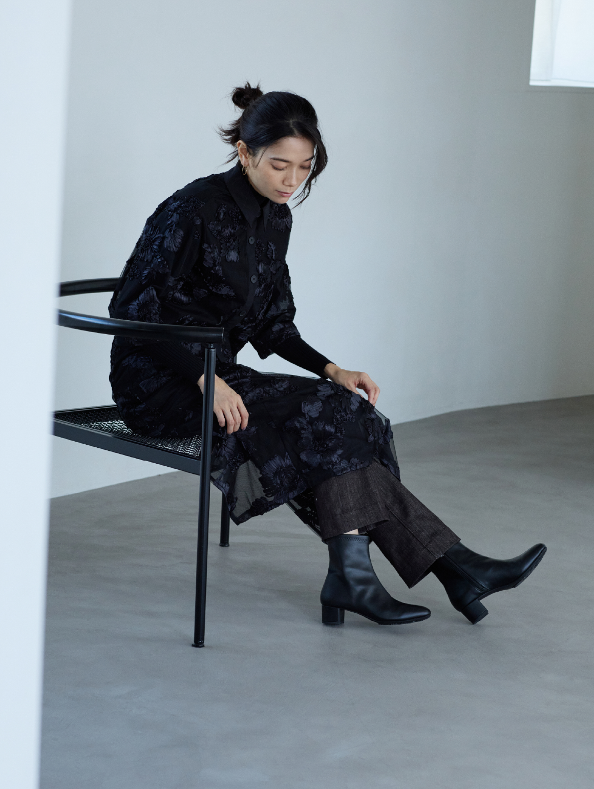 透け感のある⿊のシアー刺繍セットアップで品よく⼥性らしさを漂わせつつ、あえてブラウンカラーのデニムを合わせて、ほどよい外しをプラス。⾜元はすっきりとしたブーツで引き締めると、全体がシックにまとまる。異素材ミックスのコーデもブーツがすっきり全体と引き締めてくれる。AO-10250