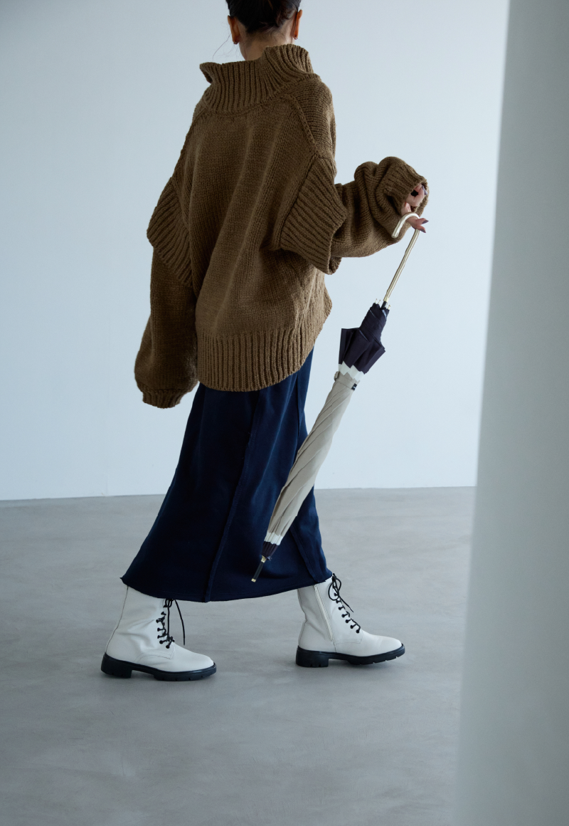 ⿊のミニマムなデザインのストレッチミドルブーツが主役の抜け感とエッジさを効かせたモードカジュアル。