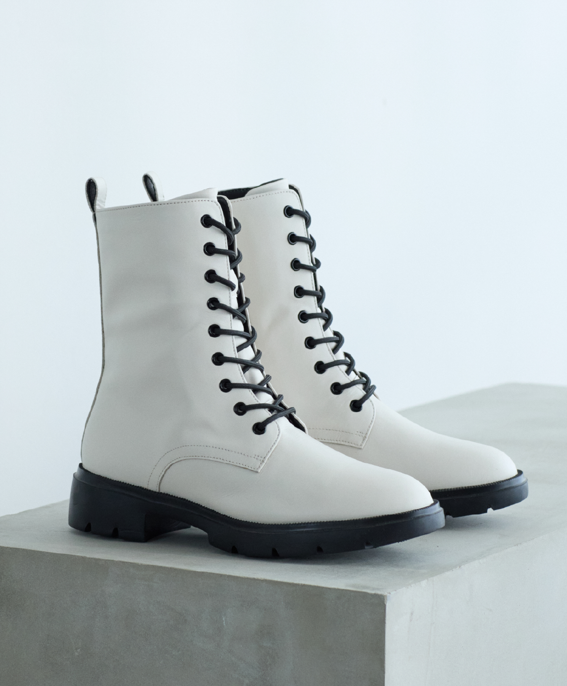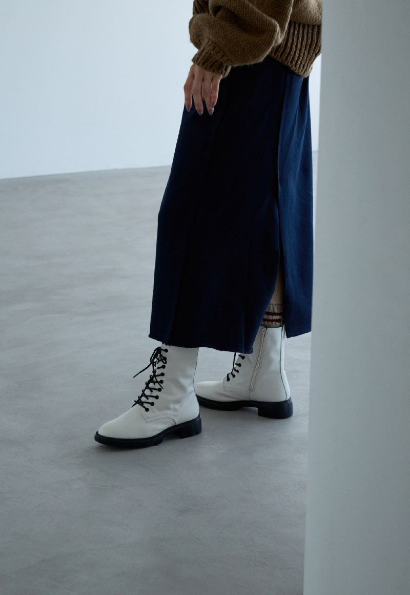 オフホワイトのレースアップブーツを主役に、秋のこなれ感を意識したカジュアルスタイル。
