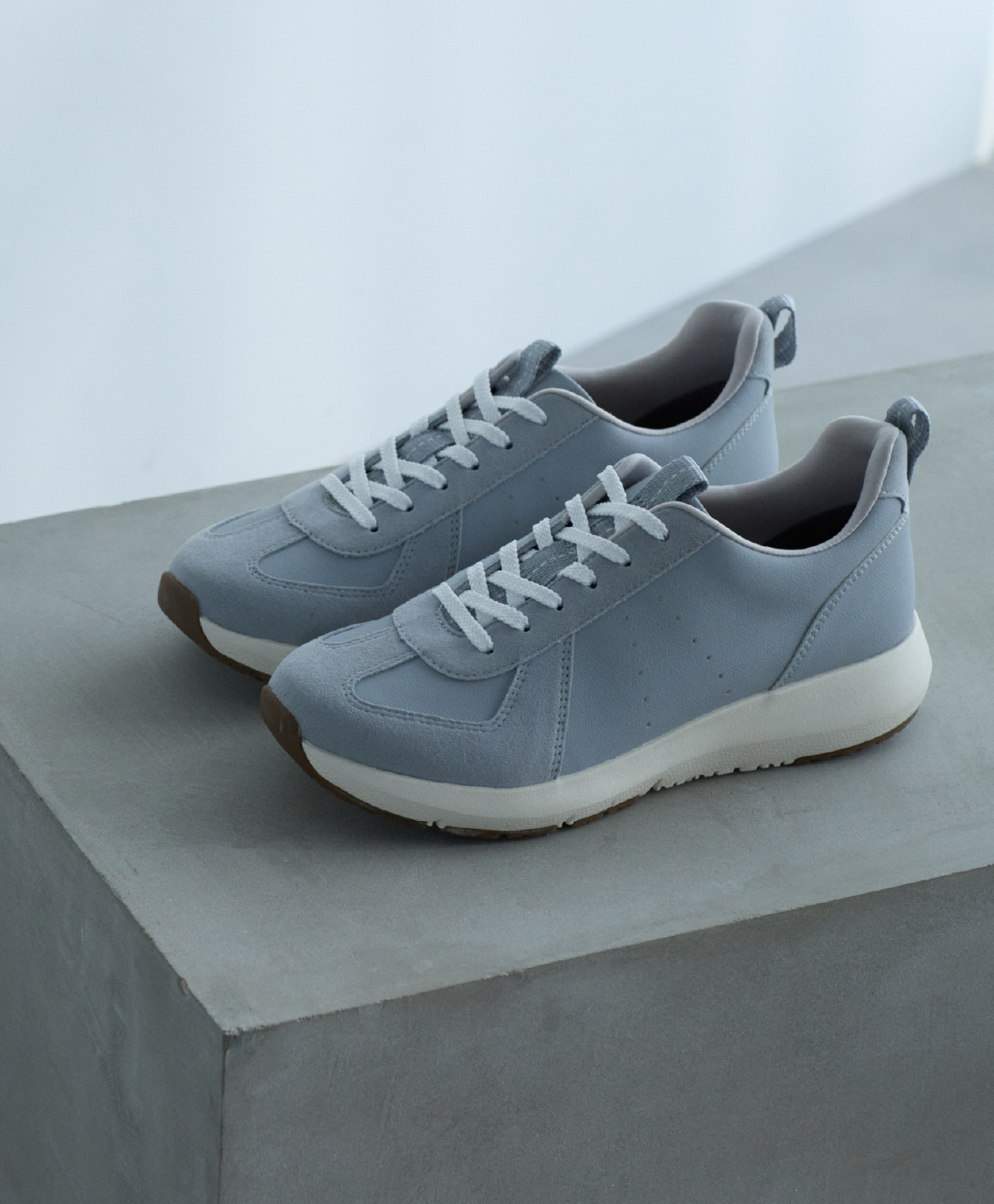 ほどよい抜け感のグレーのスニーカーに合わせて、全体はきちんと感を意識したワントーンスタイル。