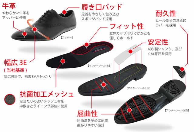 - 小穴飾りがさりげないアクセントになった、トラッドスタイルで汎用性の高いスタイリッシュなフォルムです。幅広3E相当のラストを採用することで指先にゆとりをもたせ、足指を動かしてしっかり踏ん張ることができるようにしています。ソフトな牛革を用いて足馴染みを良くし、ライニングに抗菌加工(当社基準)のメッシュ素材を採用しています。