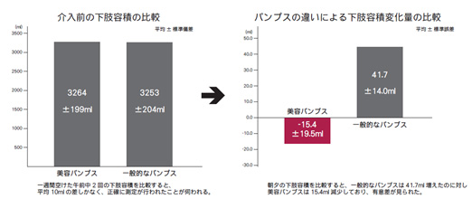 機能構造を検証するため、本商品と一般のパンプスとを交互に履くブラインドクロスオーバー試験を実施しました。着用前(朝)と着用後(夕)の下肢容積変化量を比較した結果、美容パンプスを装着した時に下肢容積の減少が確認されました。(n=12)