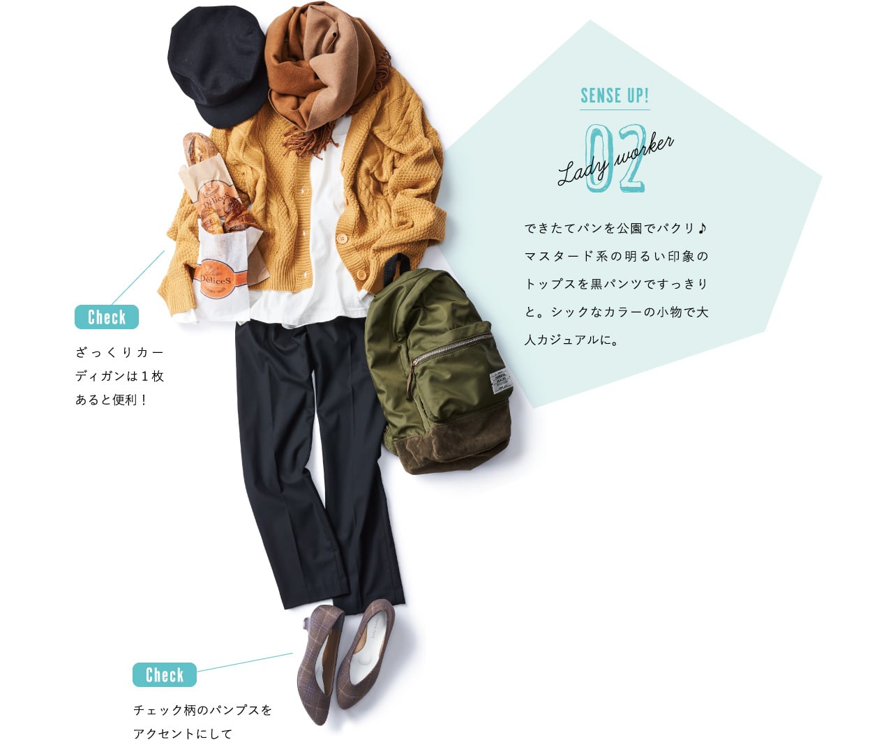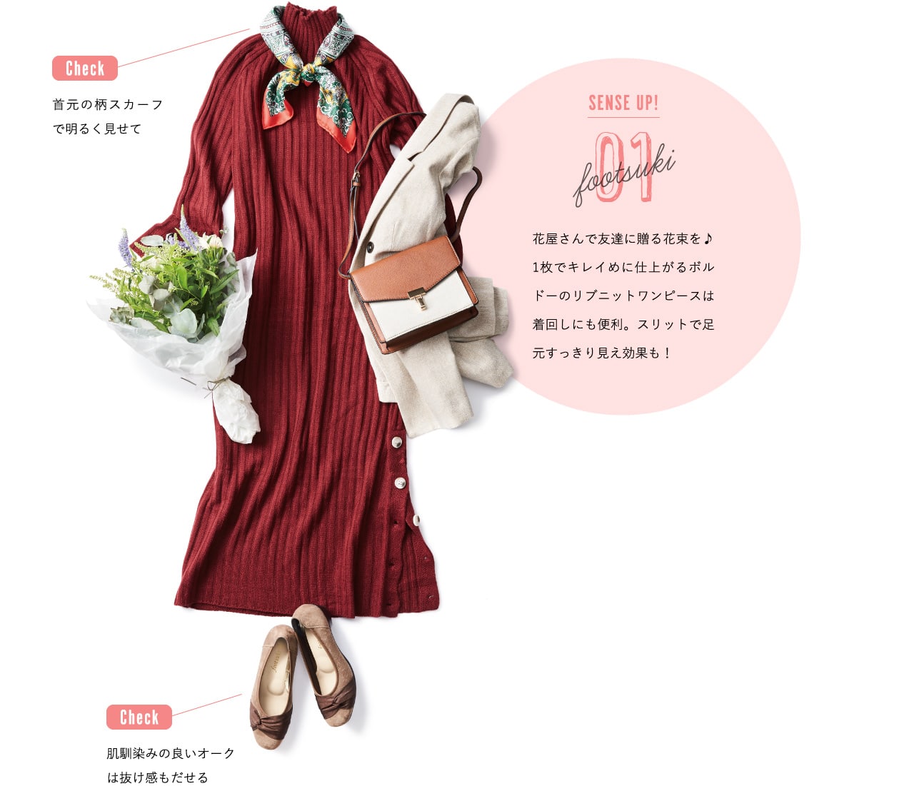 SENSE UP! footsuki 01 Check 首元の柄スカーフで明るく見せて Check 肌馴染みの良いオークは抜け感もだせる