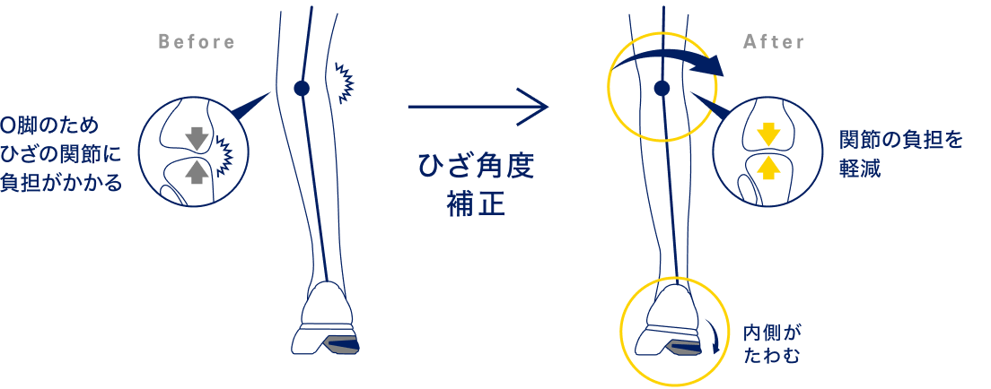 ひざの角度を適切な状態へ補正して、ひざ関節にかかる負担を軽減します。