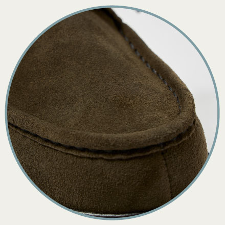 オリーブグリーンとベージュのしなやかなスウェードアッパーに