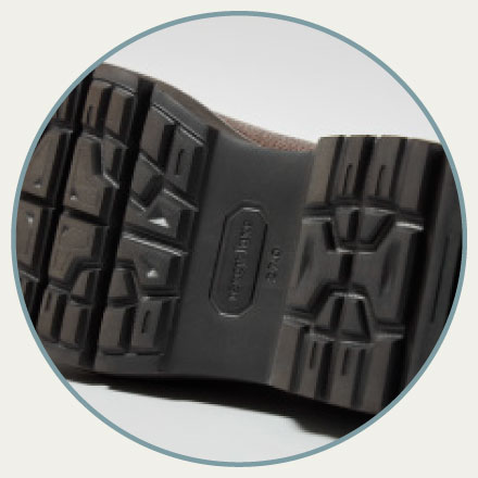 靴底に四本の横溝を配置し、足なりに屈曲するしなやかな仕様に。ヒール部分に施された耐久性とグリップ力の高いラバーが、不安定な路面コンディションで力を発揮してくれる。