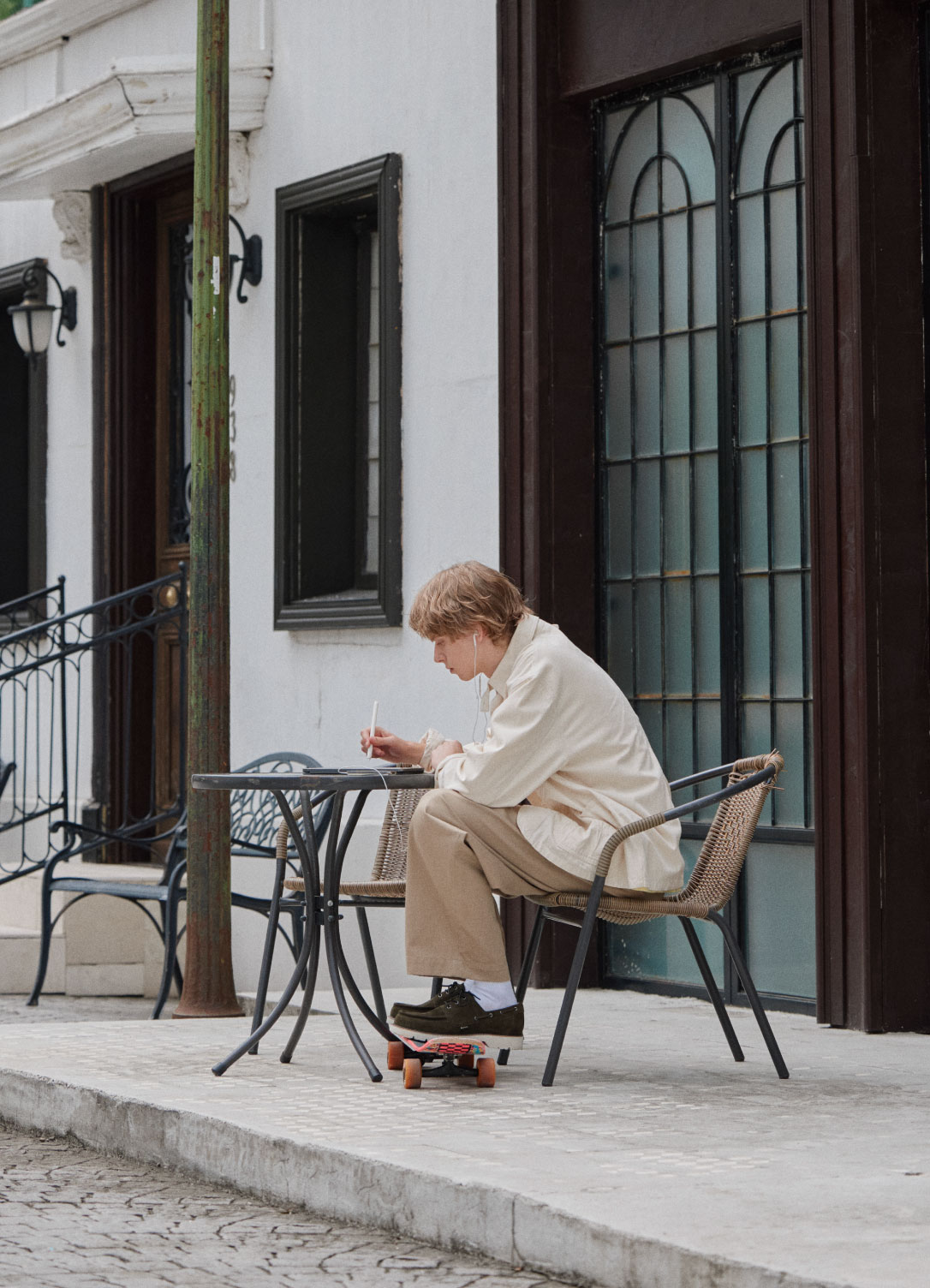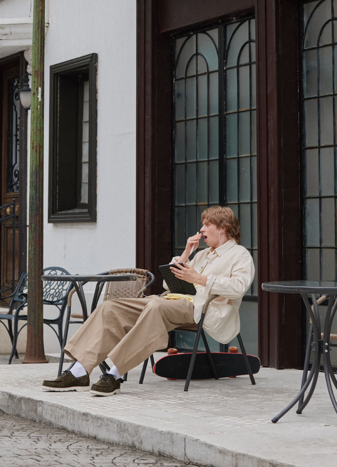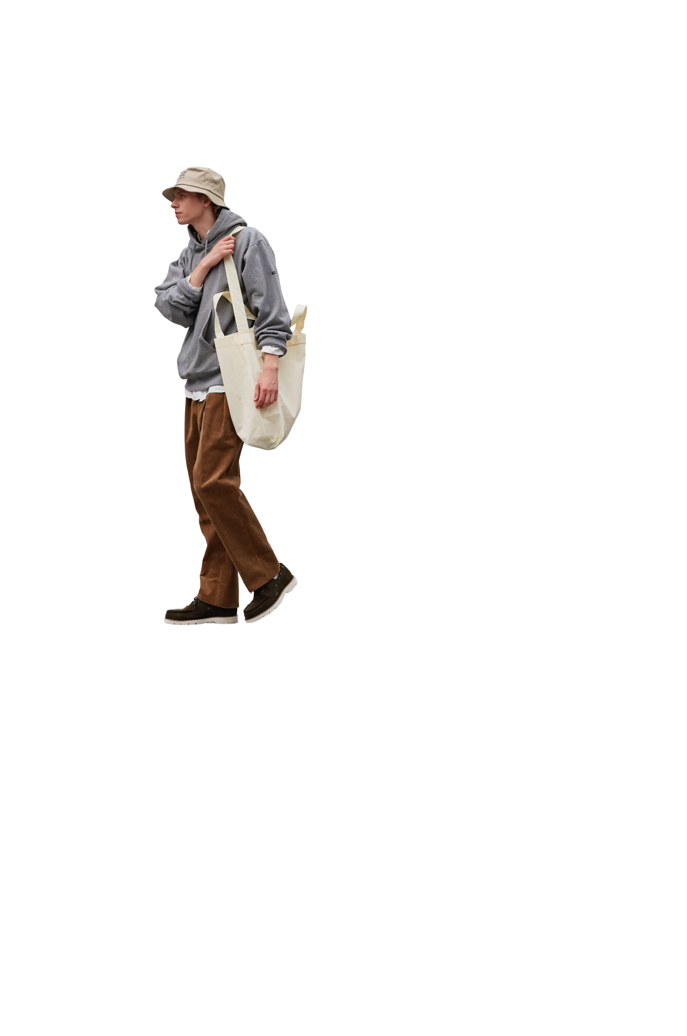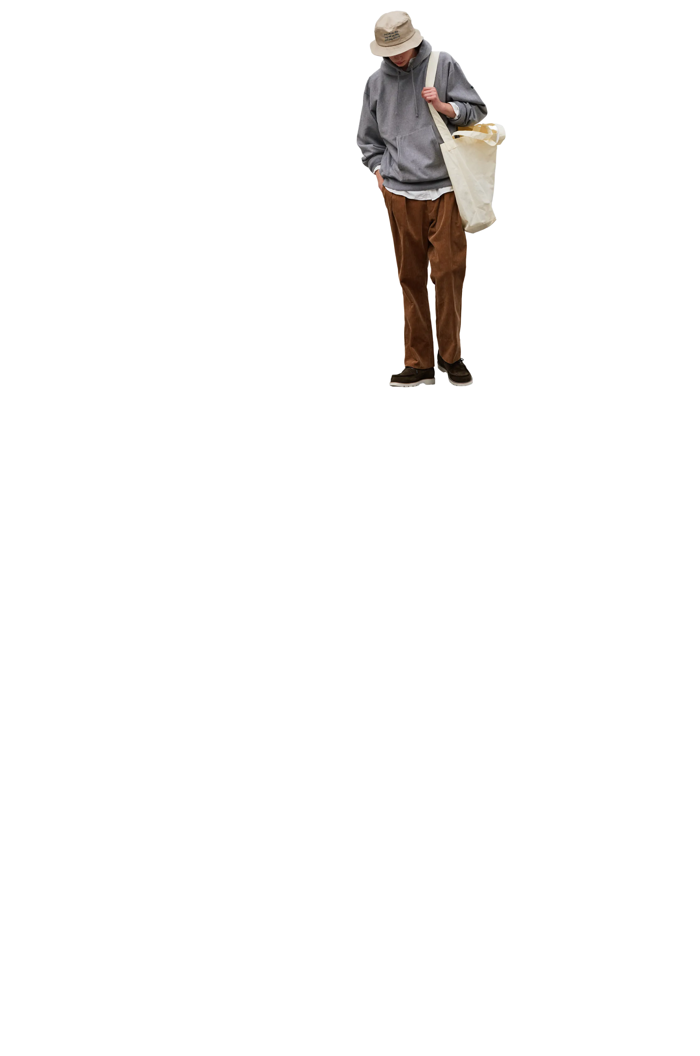 スウェットパーカ、コーデュロイパンツ、バケットハット。そんなカジュアル&リラックスな着こなしを、インナーの白シャツとモカシンシューズでほんのり大人顔に。堅さは加えたくないけど少し引き締めたい。そんな気分のあなたにオススメ。
