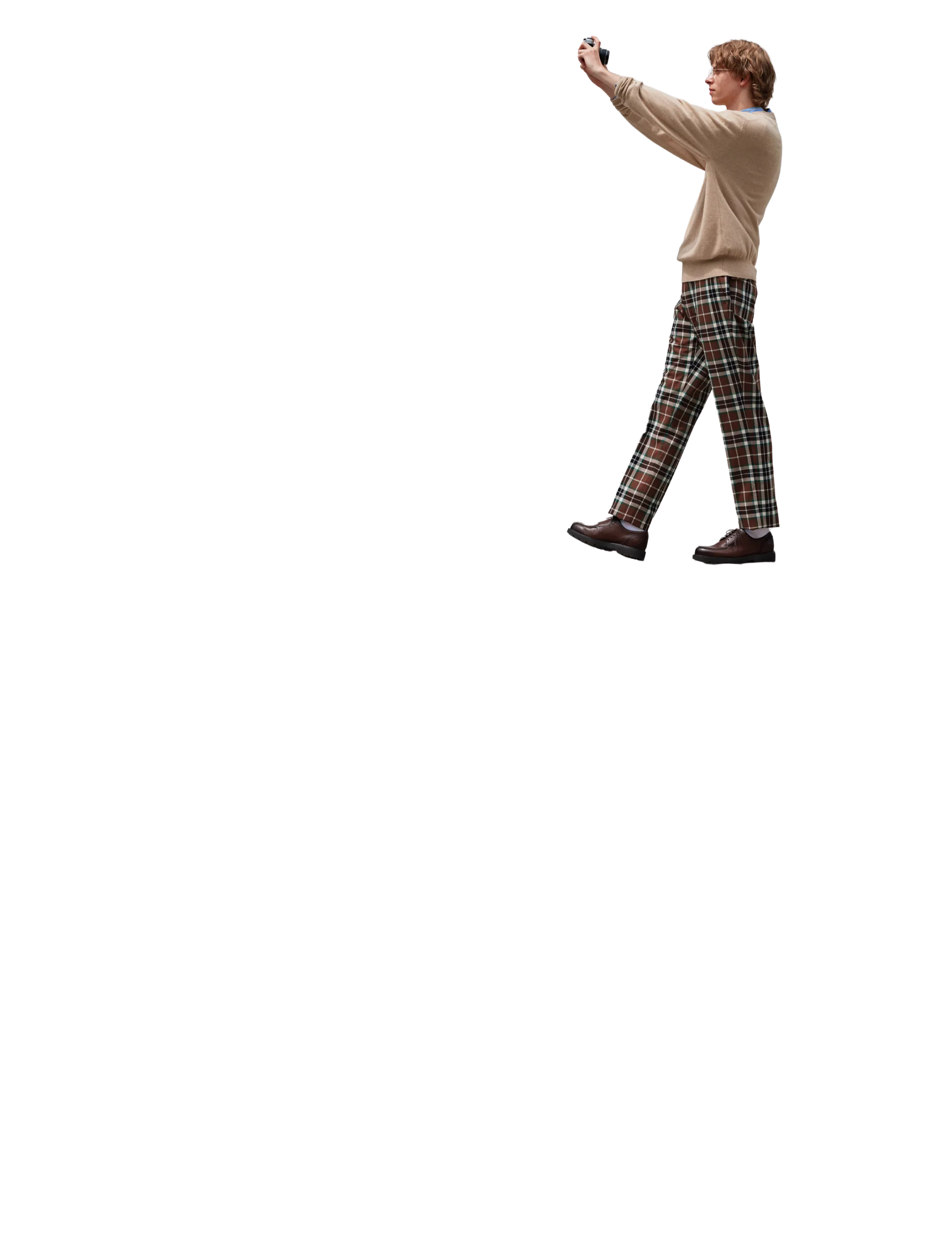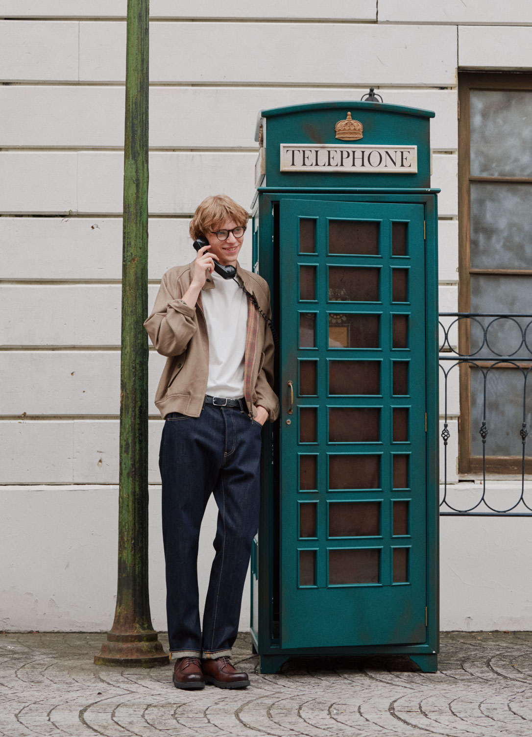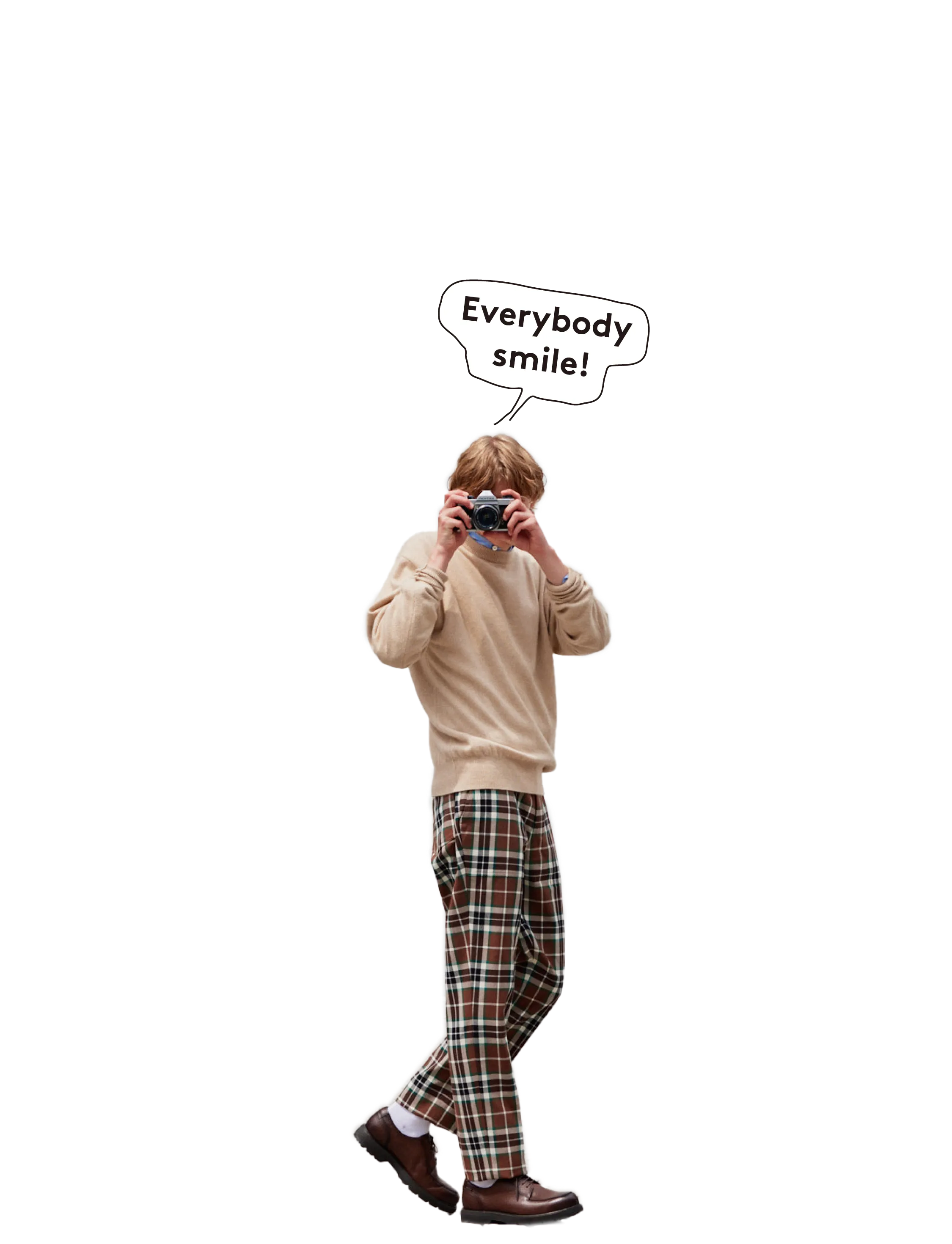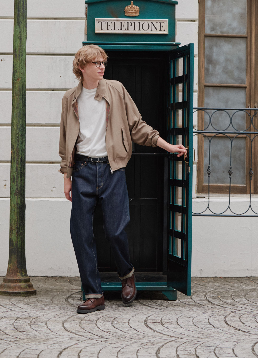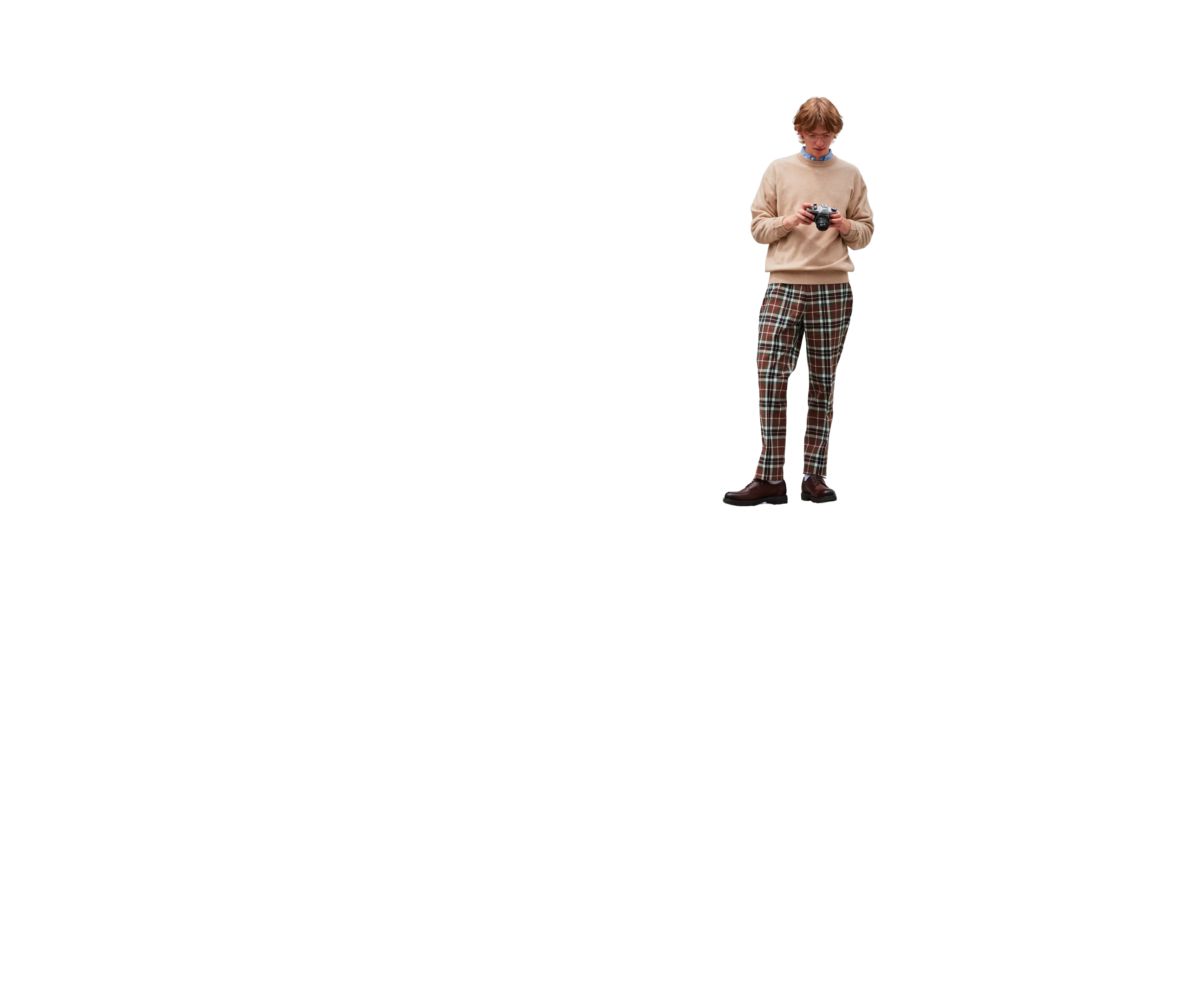 ベージュのセーターとハウスチェックのトラウザーズで深まる季節感を表現。そんな正統派ブリットスタイルとラウンドトゥシューズは、もはや黄金比率とでもいうべき組み合わせ。ちらりと覗くサックスシャツで晩夏の匂いを残した小粋さも渋い。