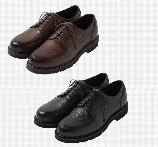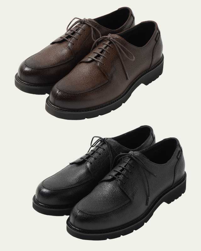 貫禄たっぷりの表情豊かな顔付きは、シボ革仕立てのアッパーに施したアンティーク加工のおかげ。撥水材や撥水加工糸などの機能素材をふんだんに取り入れて、防水性もアップ。